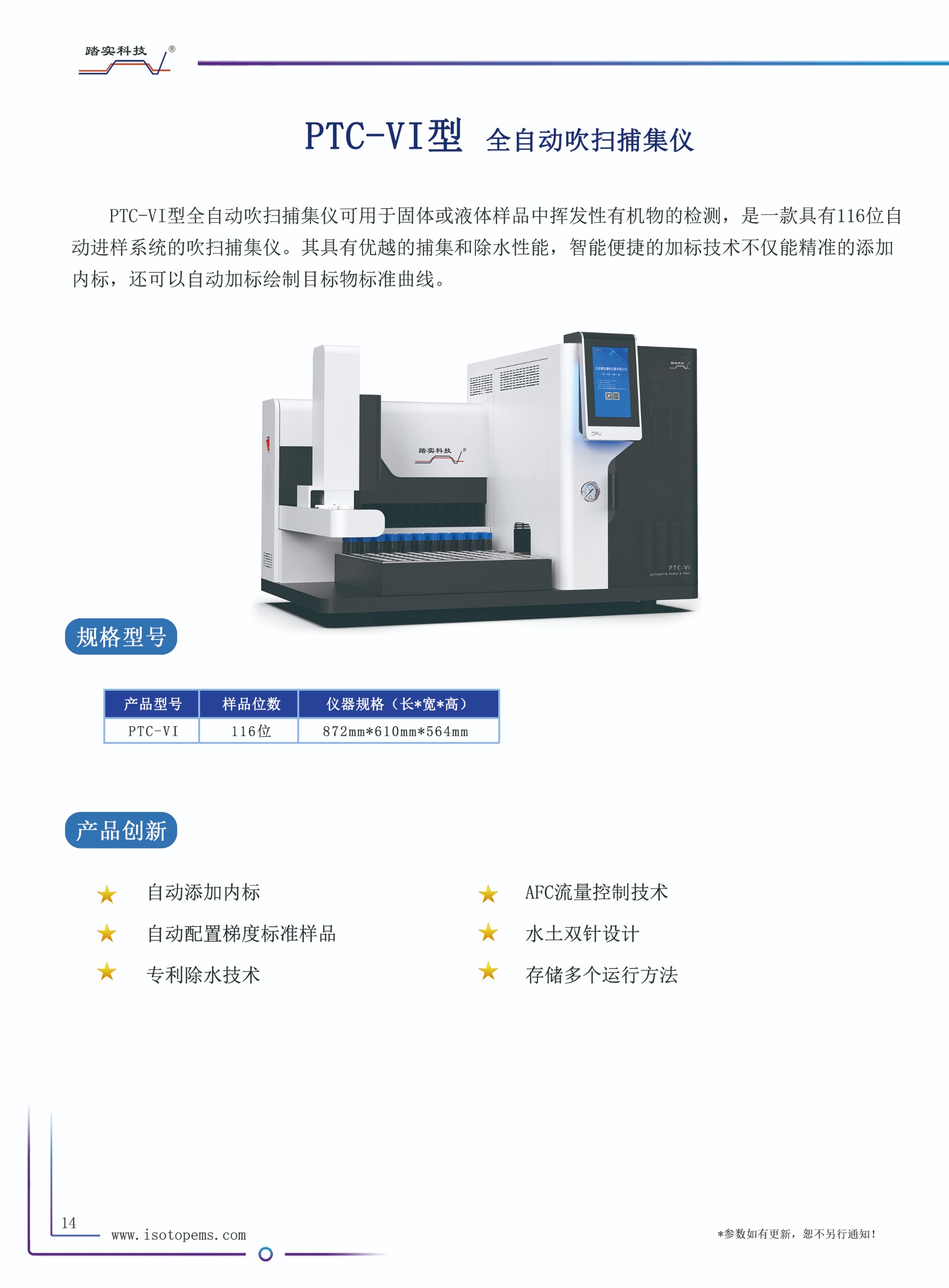 PTC-VI型全自動(dòng)吹掃捕集儀可用于固體或液體樣品中揮發(fā)性有機(jī)物的檢測(cè),是一款具有116位自動(dòng)進(jìn)樣系統(tǒng)的吹掃捕集儀。其具有優(yōu)越的捕集和除水性能,智能便捷的加標(biāo)技術(shù)不僅能精準(zhǔn)的添加內(nèi)標(biāo),還可以自動(dòng)加標(biāo)繪制目標(biāo)物標(biāo)準(zhǔn)曲線。通過與GC或GC-MS的聯(lián)用,可以廣泛應(yīng)用于環(huán)境分析,如飲用水、廢水、土壤中的有機(jī)污染物分析,也可用于食品中揮發(fā)物(如氣味成分)的分析等。該款儀器符合《HJ639-2012水質(zhì) 揮發(fā)性有機(jī)物的測(cè)定 吹掃捕集/氣相色譜-質(zhì)譜法》、《HJ686-2014水質(zhì) 揮發(fā)性有機(jī)物的測(cè)定 吹掃捕集/氣相色譜-質(zhì)譜法》、《HJ605-2011土壤和沉積物揮發(fā)性有機(jī)物的測(cè)定 吹掃捕集/氣相色譜-質(zhì)譜法》等標(biāo)準(zhǔn)。